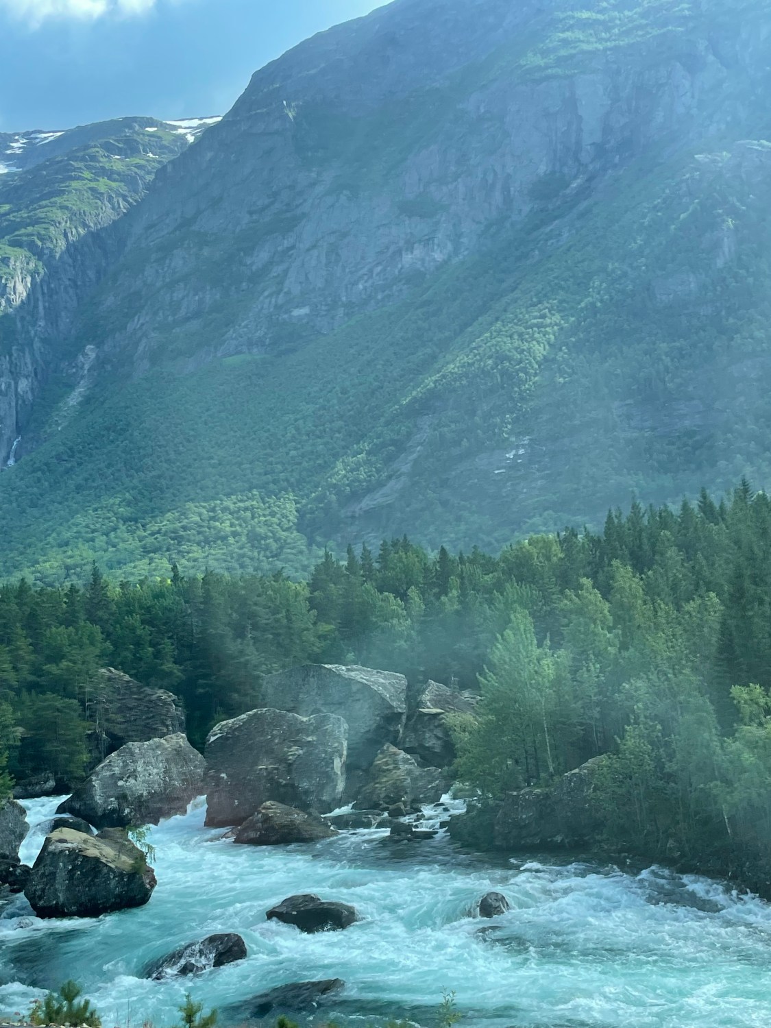 Stryn gave us major mystical landscape vibes. We passed glaciers and turquoise rivers that looked digitally enhanced, but they weren’t. We stopped so many times just to take pictures and catch our breath.