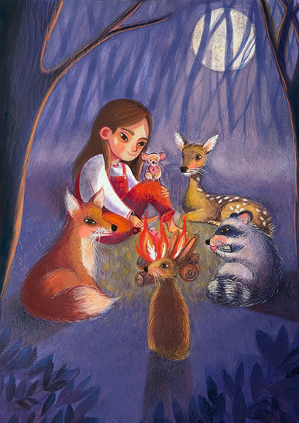 A series which feature woodland friends enjoying time together, eating marshmallows & at night time in the woods resting peacefully. See the simplicity of this series painted in gouache.